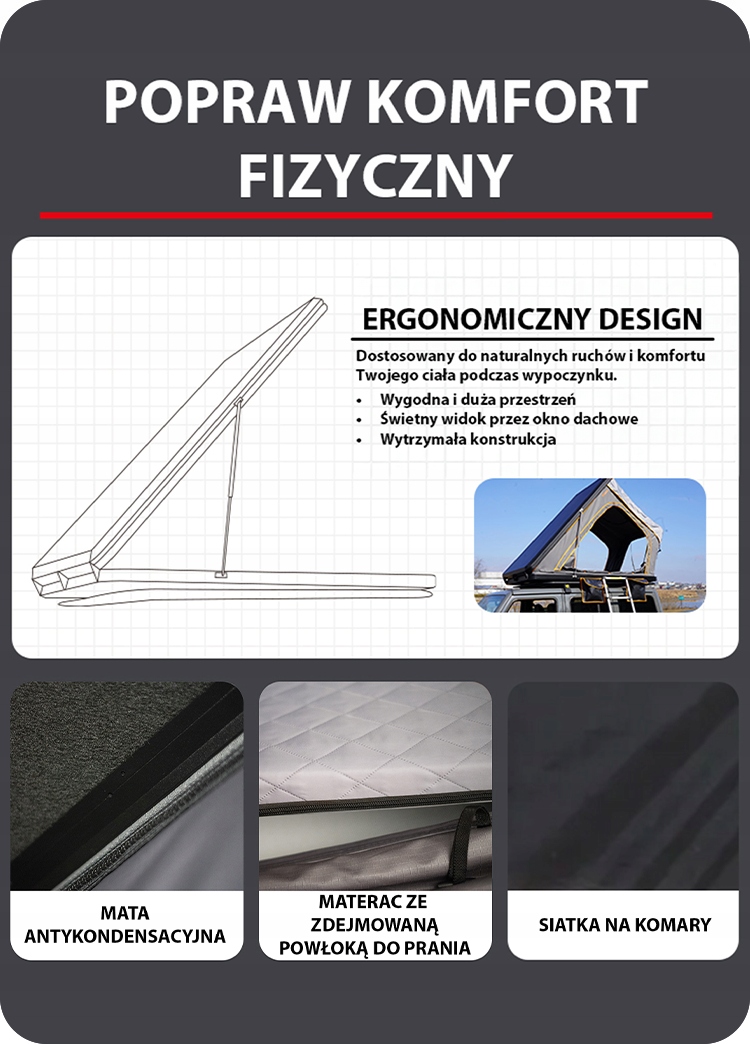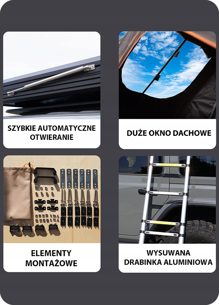✔️ Простота сборки и доступа – телескопическая алюминиевая лестница длиной 2,3 м обеспечивает быстрый и безопасный доступ, а газлифты из нержавеющей стали позволяют легко и быстро установить палатку.