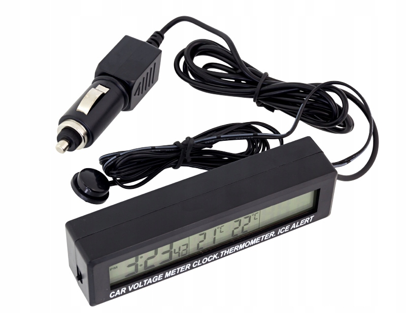 - Термометр имеет большой четкий ЖК-дисплей с подсветкой (питание от автомобильного напряжения 12 В). гнездо прикуривателя) одновременно отображает температуру от двух датчиков, время и напряжение аккумулятора!