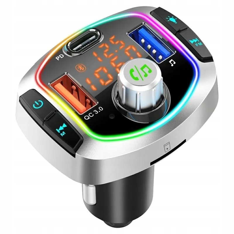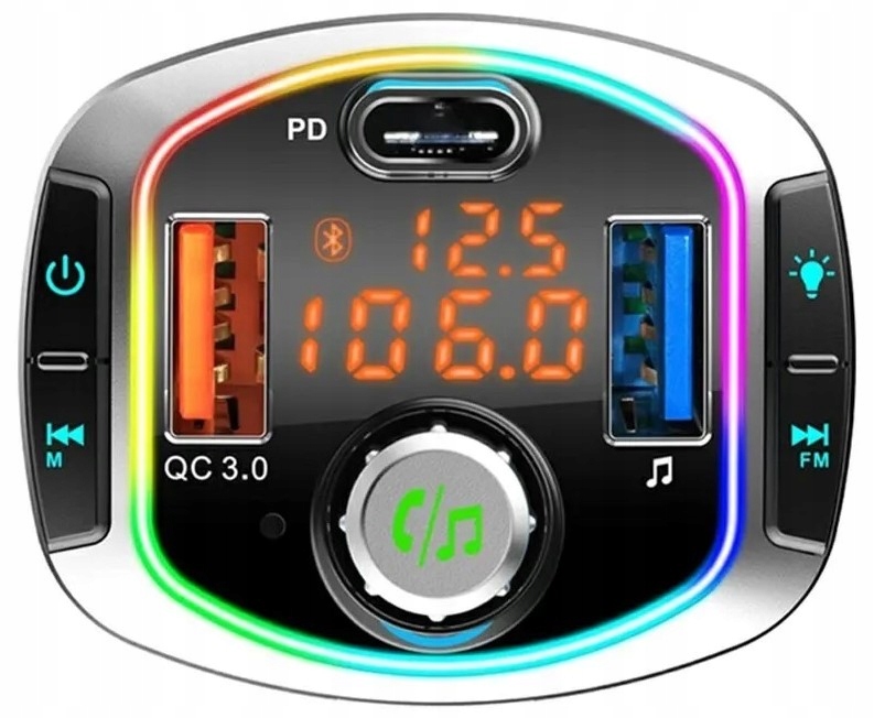 Просто подключите его к прикуривателю и воспроизводите музыку с карты microSD, через USB или подключитесь к смартфону через Bluetooth. Передатчик имеет элегантную форму и 7-цветную светодиодную подсветку, он очень стабилен. Ответить на звонок можно одним щелчком мыши.