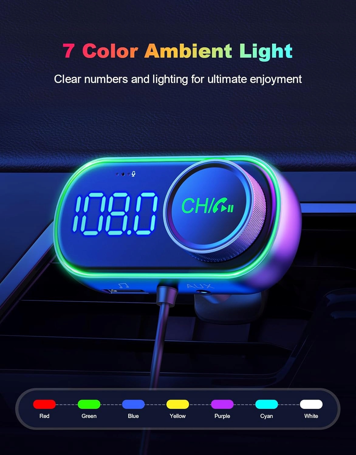 Отдельная конструкция позволяет адаптеру Bluetooth AUX вашего автомобиля удобно крепиться к вентиляционному отверстию на уровне глаз, обеспечивая более близкое рабочее расстояние и сводя к минимуму отвлекающие факторы. Читабельность в ночное время еще больше повышается за счет дисплея с большим шрифтом. Кроме того, включение RGB-подсветки улучшает визуальное восприятие, позволяя персонализировать атмосферу в вашем автомобиле.
