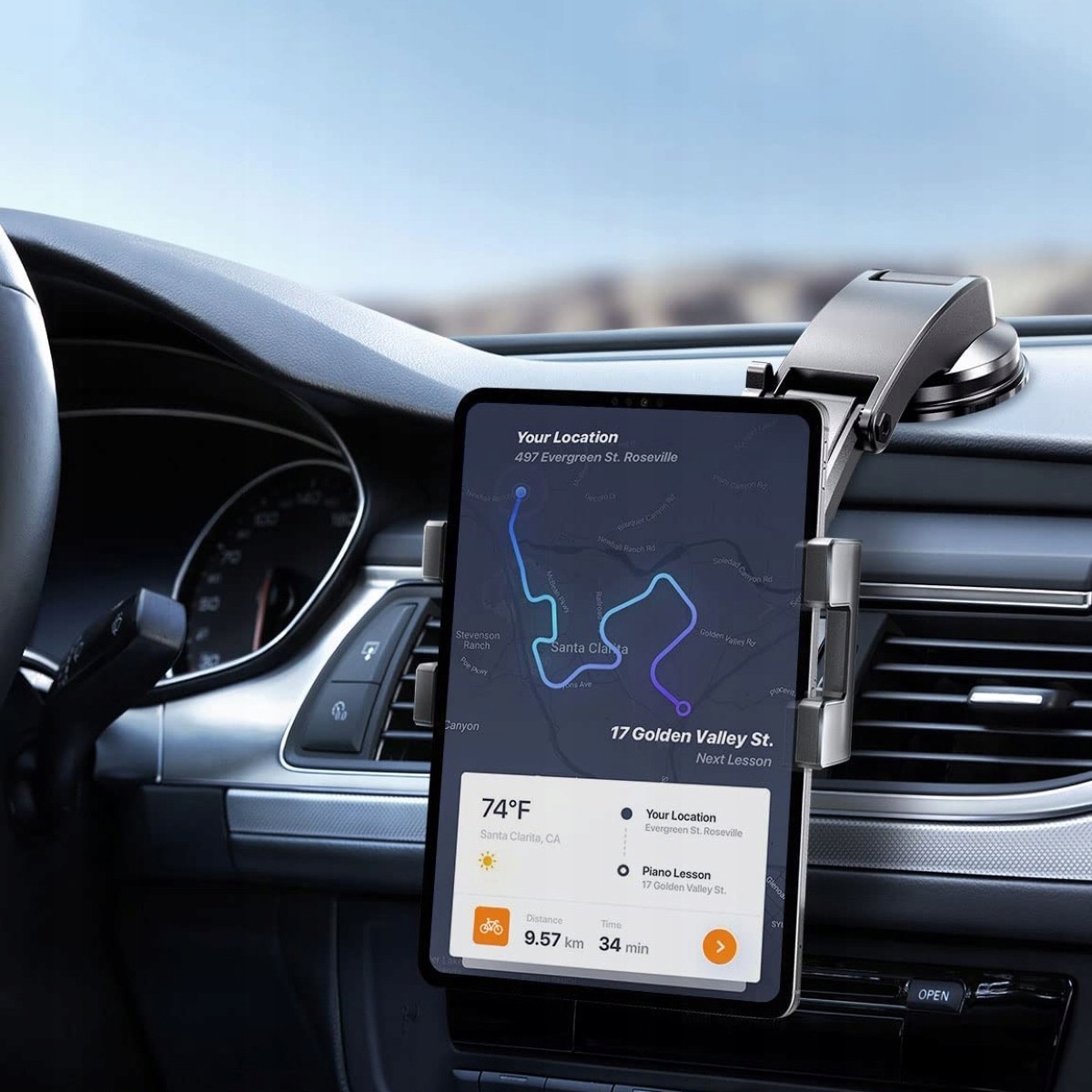 Надежный автомобильный держатель для планшета — аксессуар, который легко закрепить на приборной панели или лобовом стекле вашего автомобиля. Это делается с помощью мощной присоски, которая с большой силой присасывается к поверхности.