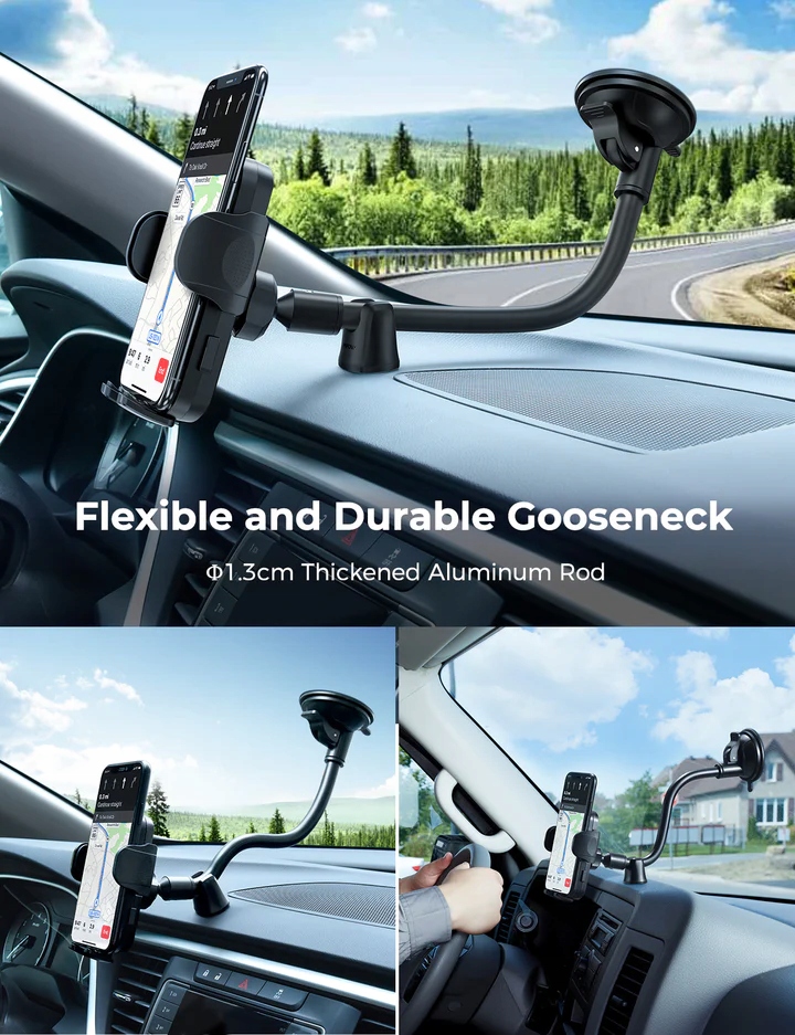 - Очень длинная гусиная шея: Гусиная шея увеличена до 20,3 см (8 дюймов), что позволяет легко просматривать экран телефона и прикасаться к нему, не вытягивая шею и руки. Длина делает держатель универсальным для любой модели автомобиля, например, пикапа, грузовика, внедорожника, седана и т. д.