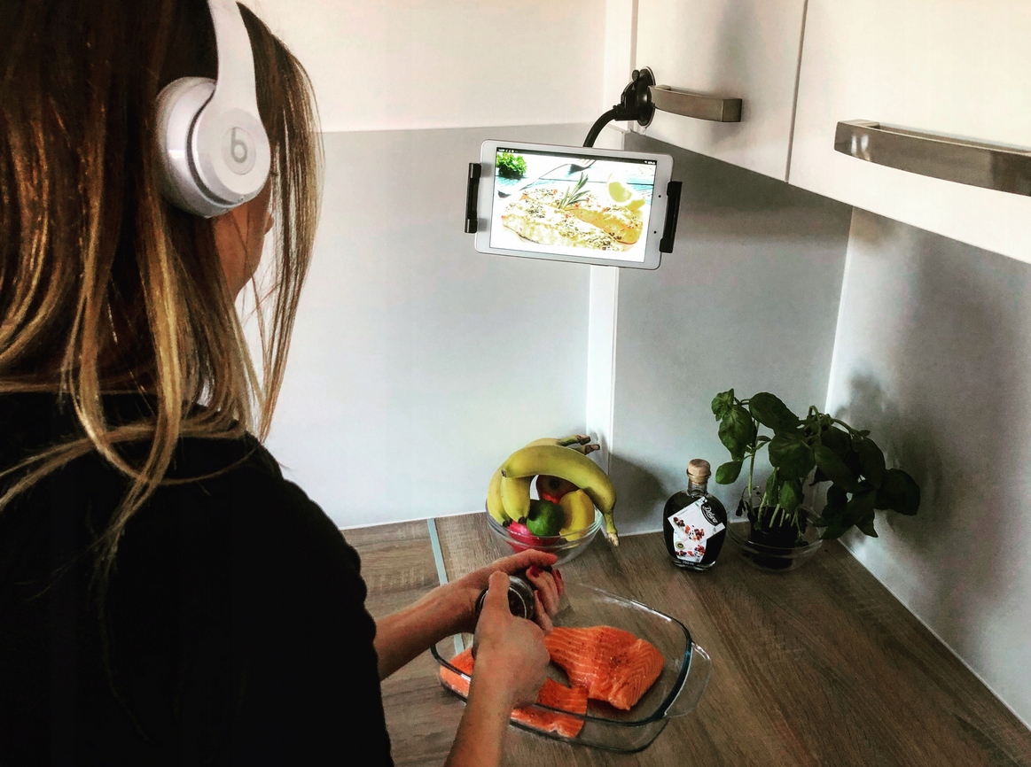 Наш держатель можно с успехом использовать на кухне в качестве держателя для планшета или телефона.