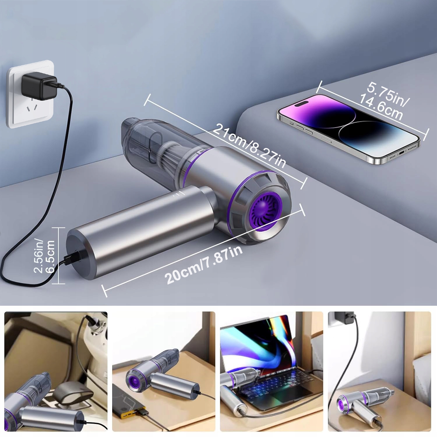 Компактный и легкий, мини -очиститель вакуума может работать с одной рукой, что позволяет удалять пыль из Burek и внутренней части автомобиля. Благодаря беспроводному дизайну, этот ручной пылесос легко транспортировать и использовать в автомобиле, дома и в офисе, а также комфортно хранить в автомобильных шкафах и ящиках столов.