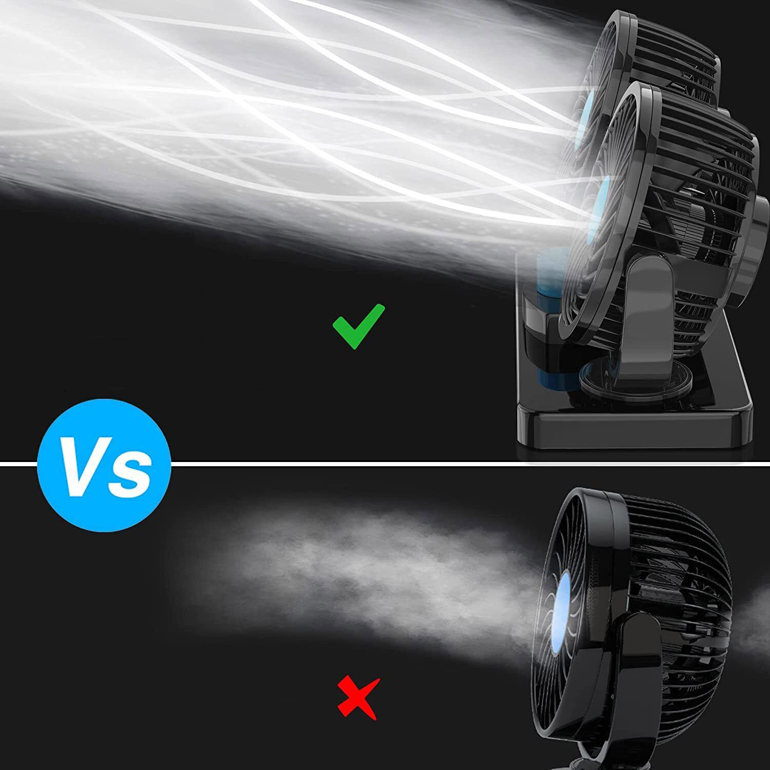 👍👍👍【Вращение на 360° с двойной головкой】Высокоэффективный вентилятор, вращающийся на 360 градусов. База быстро и эффективно удаляет запахи, улучшает циркуляцию воздуха и сохраняет воздух в транспортных средствах свежим и прохладным. 2 уровня скорости. Его можно настроить по своему усмотрению.