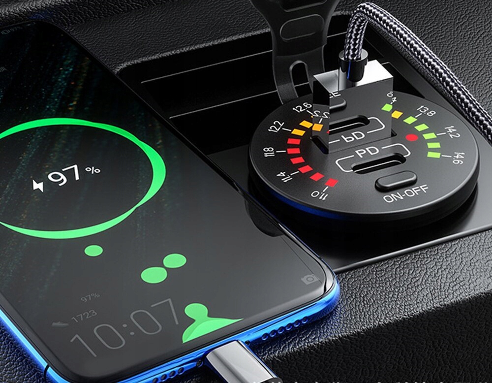 Качественное автомобильное зарядное устройство с вольтметром. Оснащен двумя портами USB и USB-C.