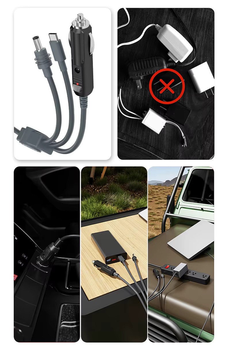 - Выход: USB-C, постоянный ток (цилиндр), автомобильная вилка.