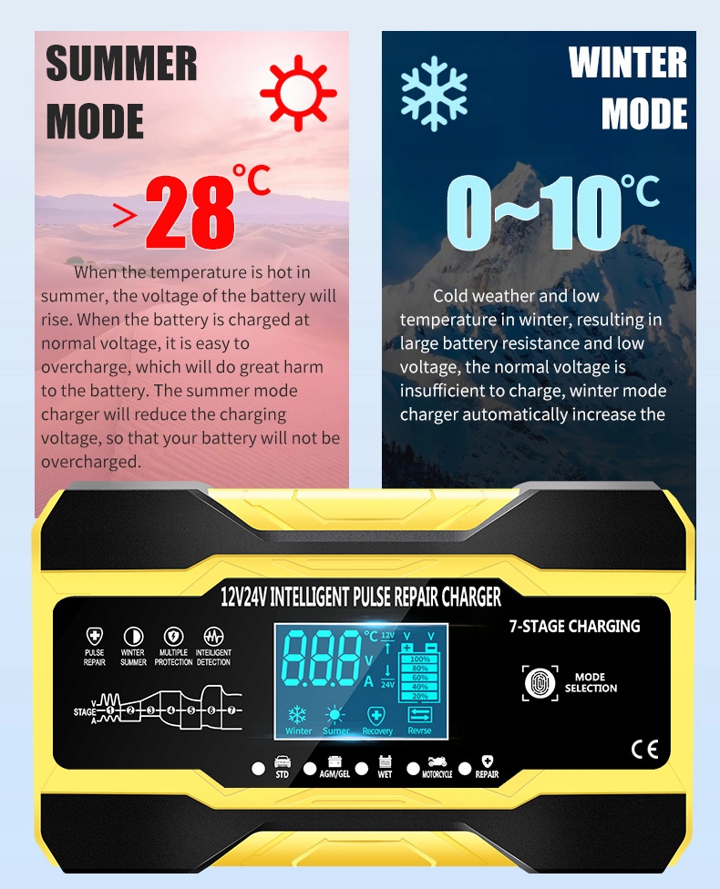 • Совместимость с напряжением 12–24 В: Зарядное устройство совместимо с аккумуляторами напряжением 12 В и 24 В, что делает его универсальным и пригодным для широкого спектра применений в транспортных средствах.