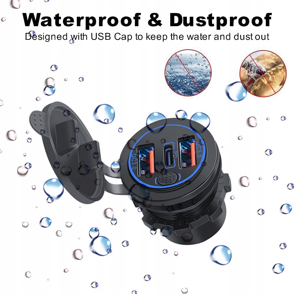 【Быстрая зарядка двойная QC 3.0 и Pd Type C】 USB 12 В сокет с двойной QC 3.0 и Fast PD Type C PD Зарядка PD, максимальный PD USB-C PD-45 Вт или QC3.0 USB 15 W + PD USB-C 20 W, когда они используются в одиночестве + QC3.0.