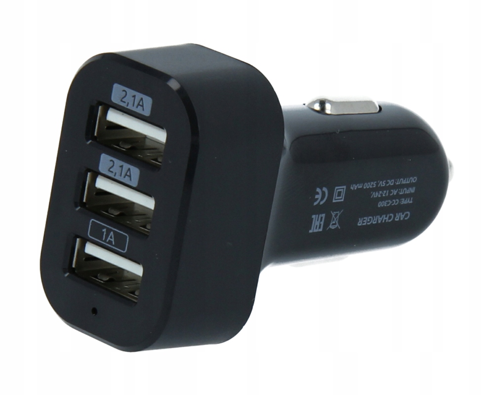 Зарядное устройство имеет 3 порта USB – два из них с током 2,1А и один порт с током 1А. Общий выходной ток автомобильного зарядного устройства составляет 5,2 А.