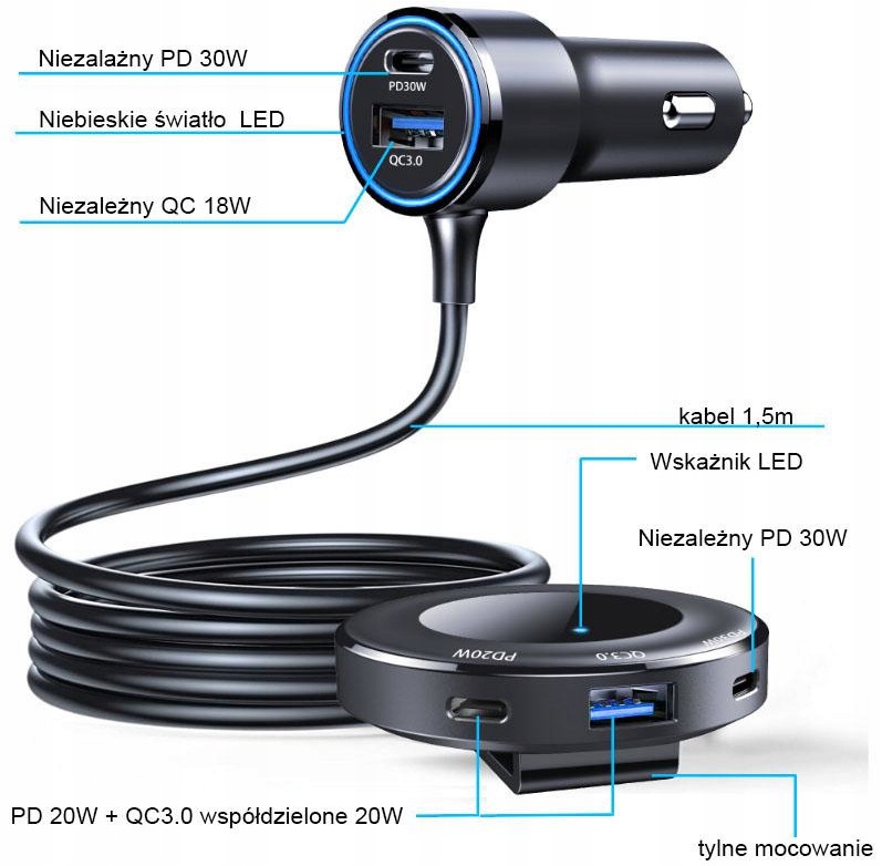 Дополнительно , длинный кабель длиной до 1,5 м позволяет сделать порты зарядки доступными для пассажиров на заднем сиденье.