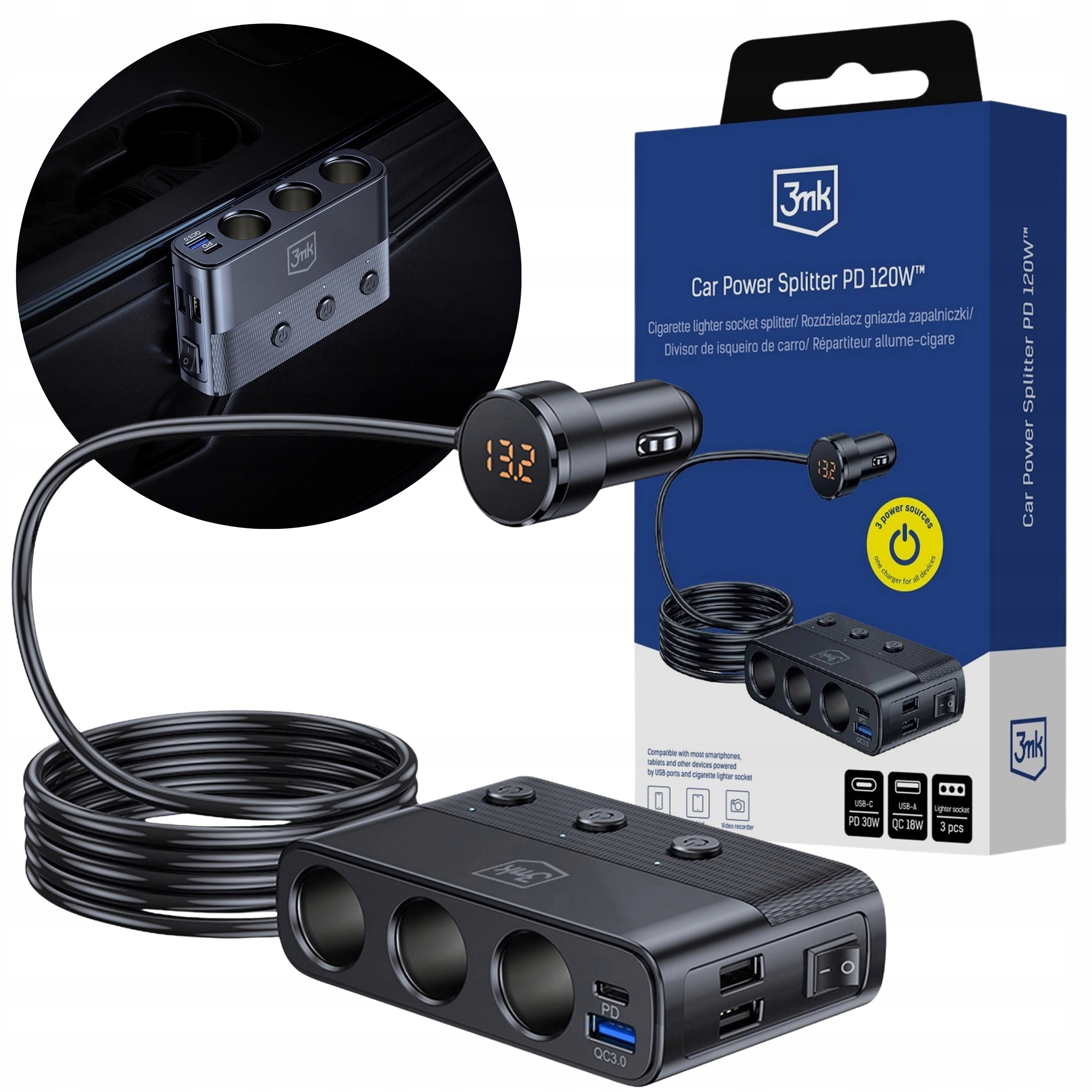 Автомобильное зарядное устройство 3mk Car Power Splitter PD 120W™ — практичное и чрезвычайно эффективное решение, позволяющее заряжать до 7 устройств одновременно за одну поездку.