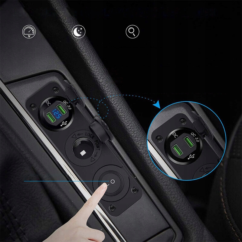 - 1x USB QC Порт для зарядки 3.0 1 гнездо прикуривателя 1 переключатель 1 основание диска