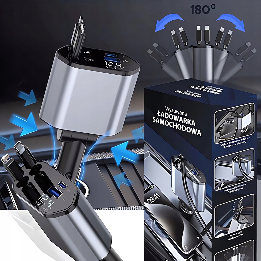 БЫСТРОЕ АВТОМОБИЛЬНОЕ ЗАРЯДНОЕ УСТРОЙСТВО ДЛЯ ТЕЛЕФОНА 4в1, ПЕРЕЗАРЯЖАЕМЫЙ КАБЕЛЬ LIGHTNING USB-C
