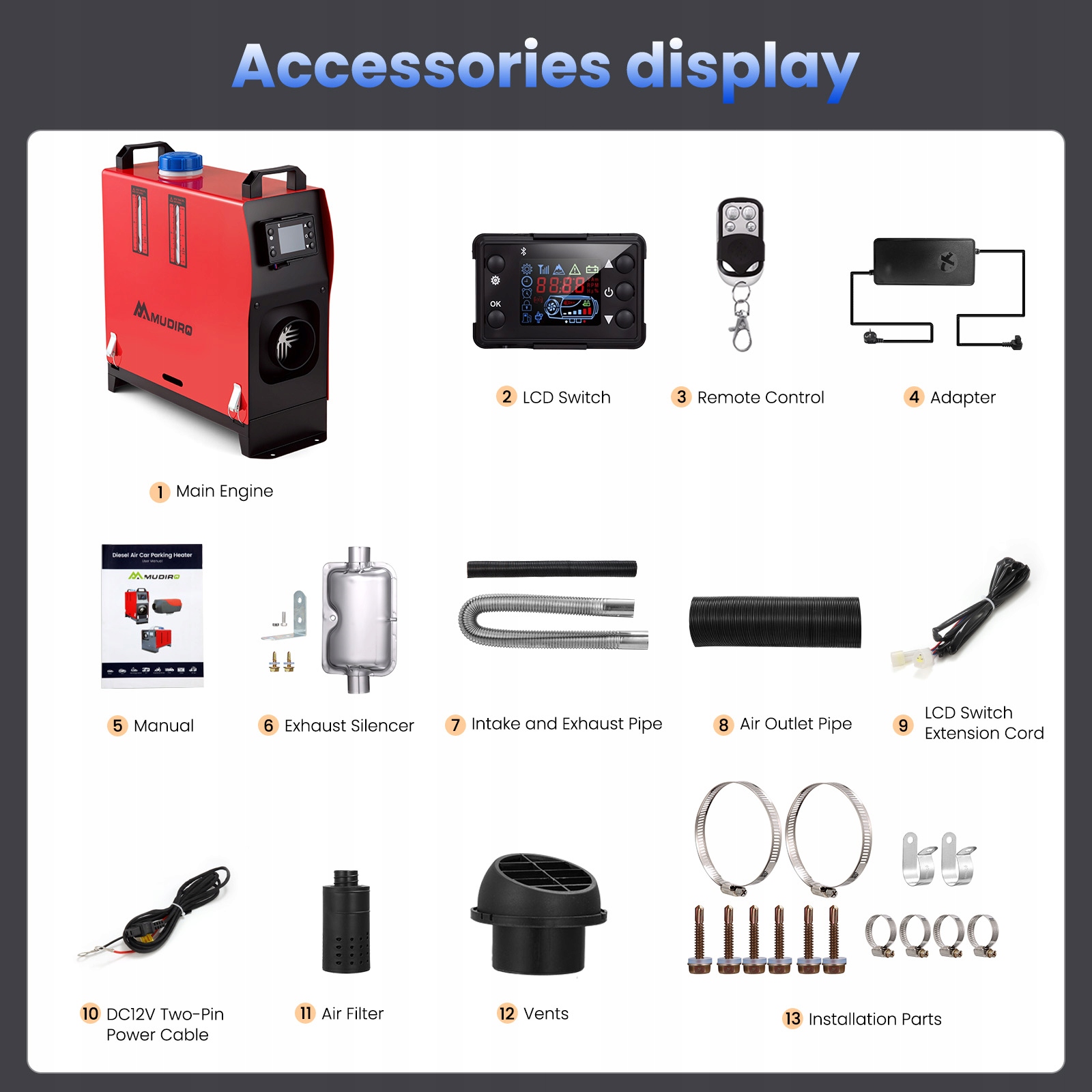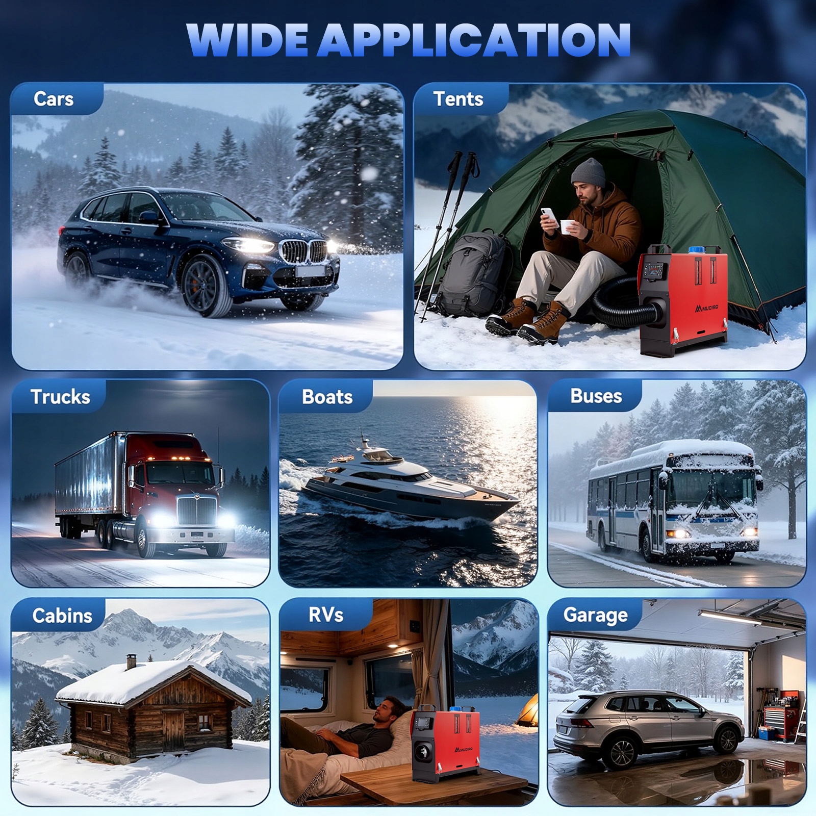 Дизельный обогреватель MUDIRO поддерживает напряжение 12 В, 24 В и включает в себя адаптер 110–240 В. Подключайте напрямую к бытовой розетке – никаких дополнительных деталей или самостоятельной работы не требуется. Наслаждайтесь надежным теплом где угодно: в гараже, доме на колесах, легковом автомобиле, грузовике, кемпере, палатке, хижине или рабочем месте. Сохраняйте тепло всю зиму.