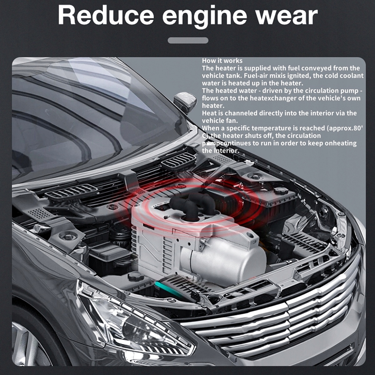 - Многофункциональность: тепловой источник для автомобиля, поднятие температуры внутри, нагревание охлаждающей жидкости и защиты от потребления при низких температурах. Это позволяет вам удалить интерьер автомобиля, запустить автомобиль зимой и разморозить стекло.