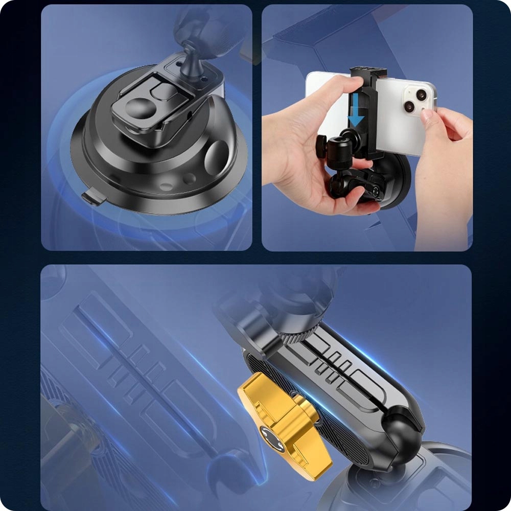 ✔️ Прочная присоска с зажимом — гарантирует устойчивое крепление на гладких поверхностях, таких как стекло, приборные панели, окна или металл.