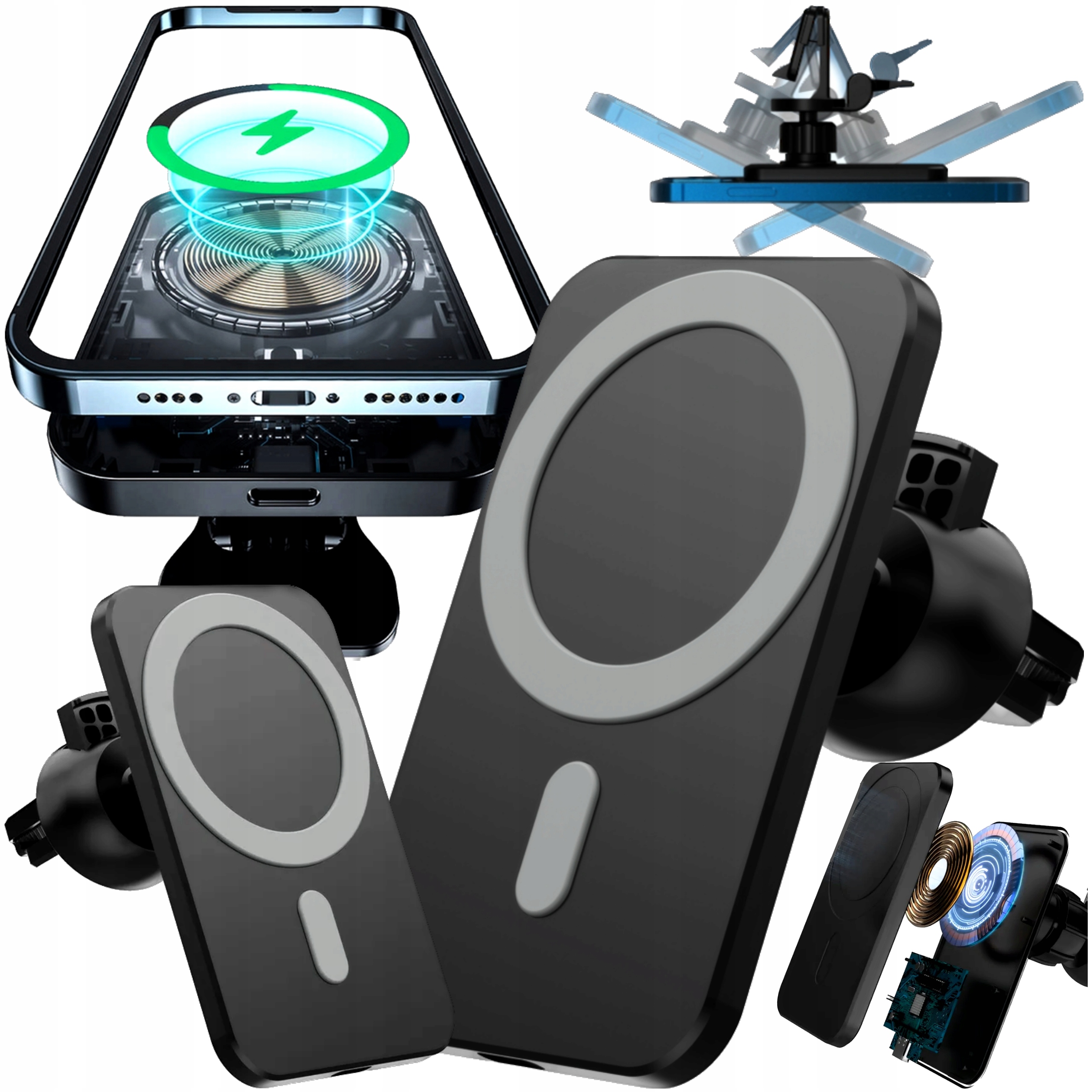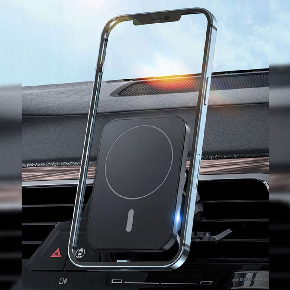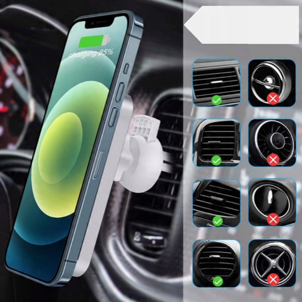 Магнитный держатель со встроенным беспроводным зарядным устройством — идеальное решение для устройств, поддерживающих беспроводную зарядку аксессуаров — просто поместите на него смартфон — магниты автоматически закрепят его на держателе.