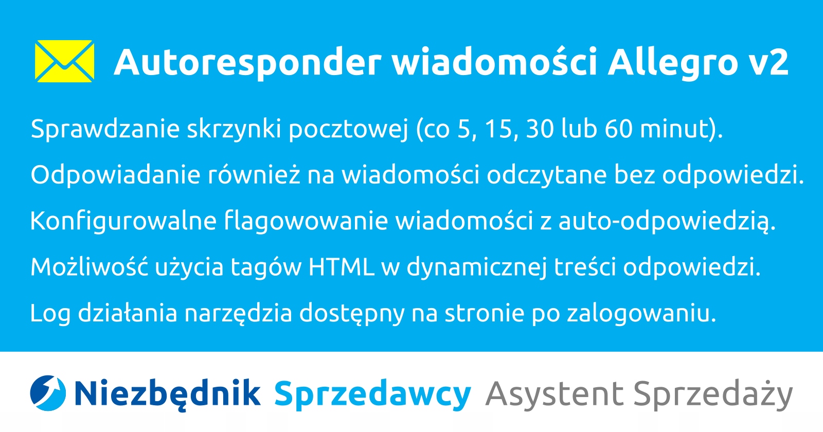 Вы приобретаете автоответчик Allegro News для вопросов, заданных через раздел «Задать вопрос». " или сообщения, отправленные через Центр сообщений. Наша компания также продает Дискуссионный Автоответчик Allegro в отдельном предложении.