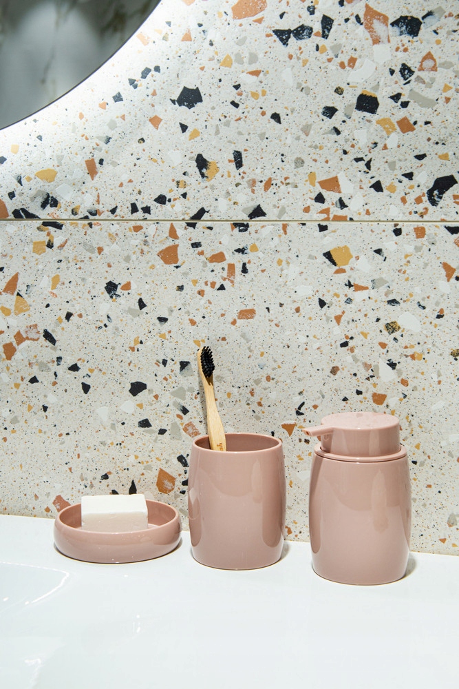 Приглушенный оттенок розового и минималистская форма создают приятную для глаз гармонию, которая хорошо подойдет для оформления ванной комнаты.