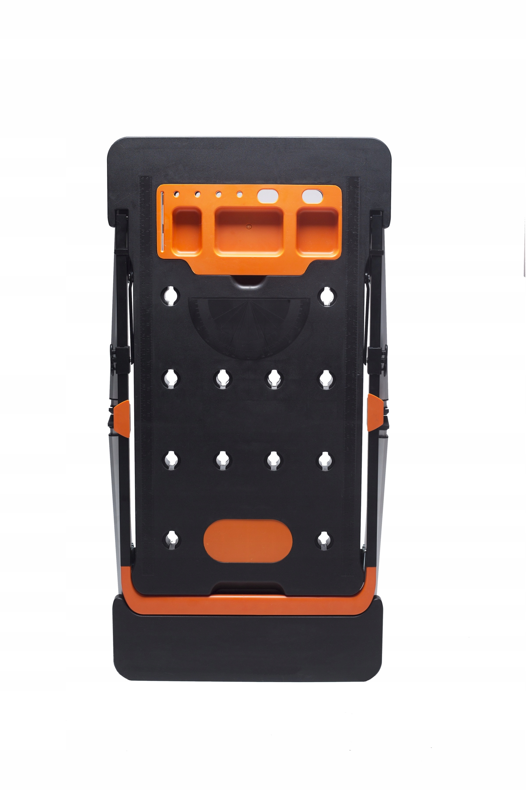 Оснащен лотком для инструментов, угольником, линейкой, отверстиями для столярных струбцин, ручкой 2-в-1 и буксирным отверстием.