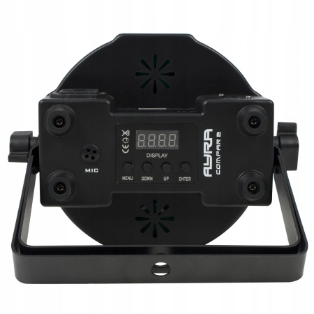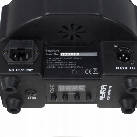 Профессиональный светодиодный прожектор ComPar 2 от Ayra. В светильнике установлено 54 светодиода 5050 RGB SMD. Устройство полностью управляется через DMX или может работать в режимах «Авто», «Звук» и «Главный/ведомый». Оборудование оснащено четким дисплеем и в комплект входит пульт дистанционного управления. Идеальные точечные светильники для освещения помещений, сцен или улицы. Они также идеально подходят в качестве подсветки для диджейской будки.