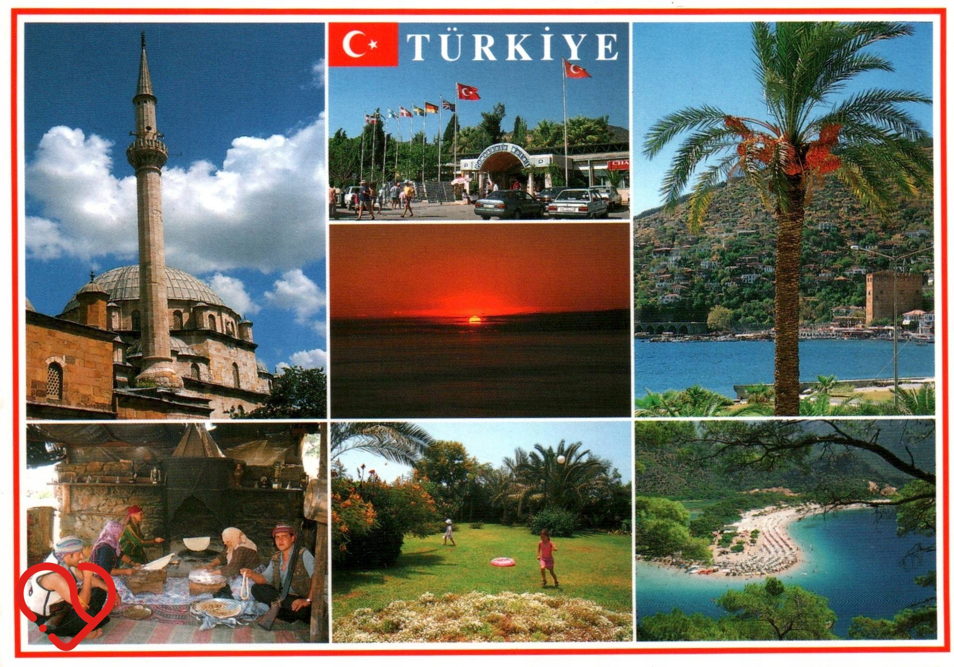 На открытке изображены разнообразные лица Турции – от исторических мечетей и местных кулинарных традиций до живописных пляжей, горных пейзажей и закатов. На фотоколлаже мы узнаем, среди прочего: