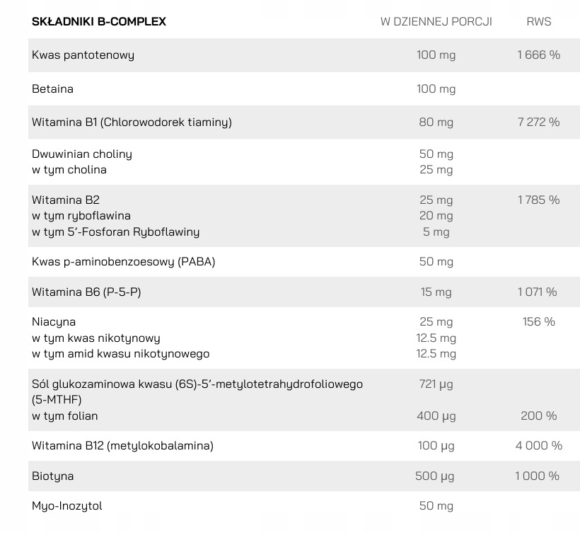 Добавка особенно рекомендуется для людей с мутацией гена MTHFR, которая поражает около 50% польских женщин и ограничивает поглощение фолиевой кислоты. B-Complex Slavic Labs содержит метилфолианскую (кислотную глюкозаминную соль (6S) -5-метитотрагидрофолическое) -а активную форму, которая обеспечивает полную биодоступность и позволяет дополнить дефицит