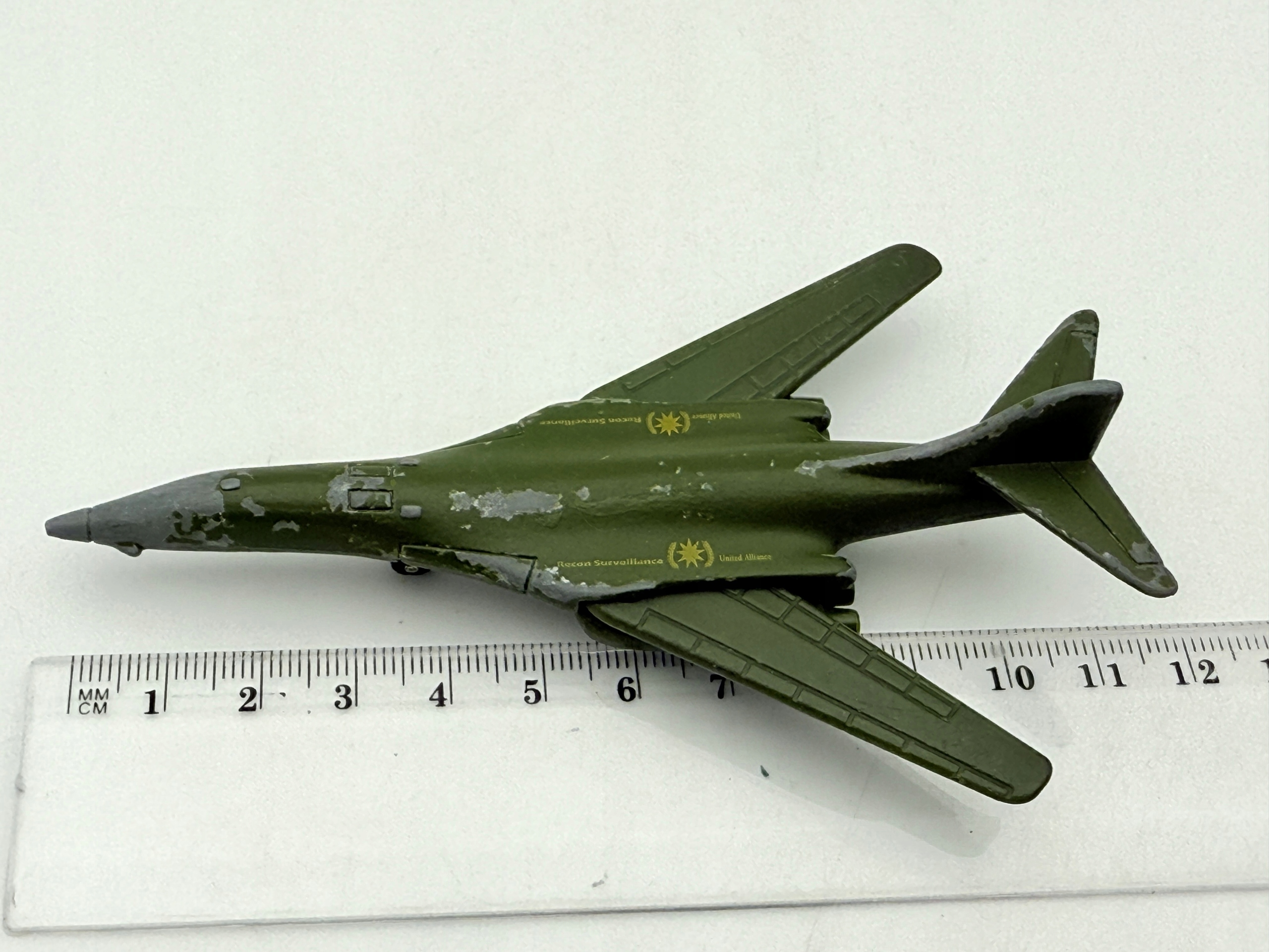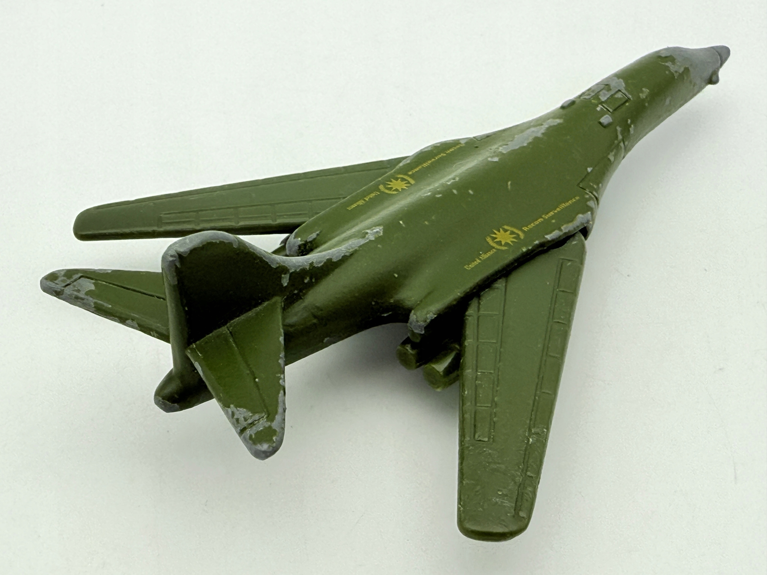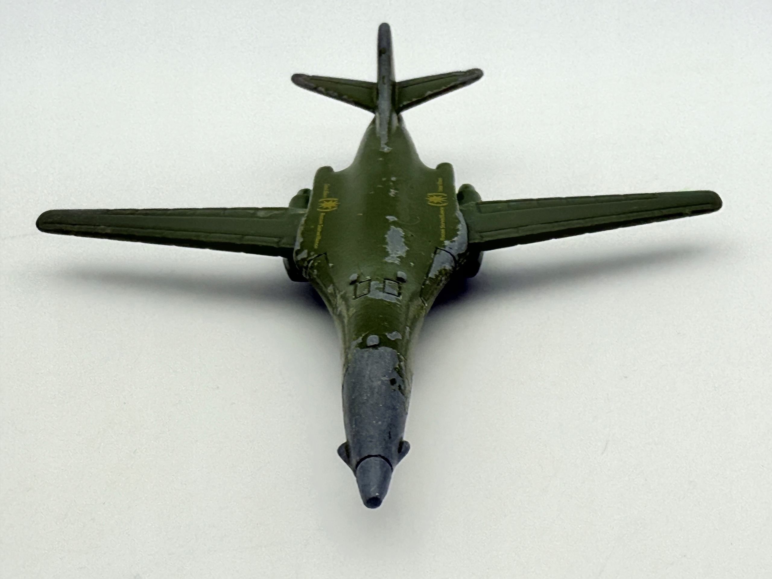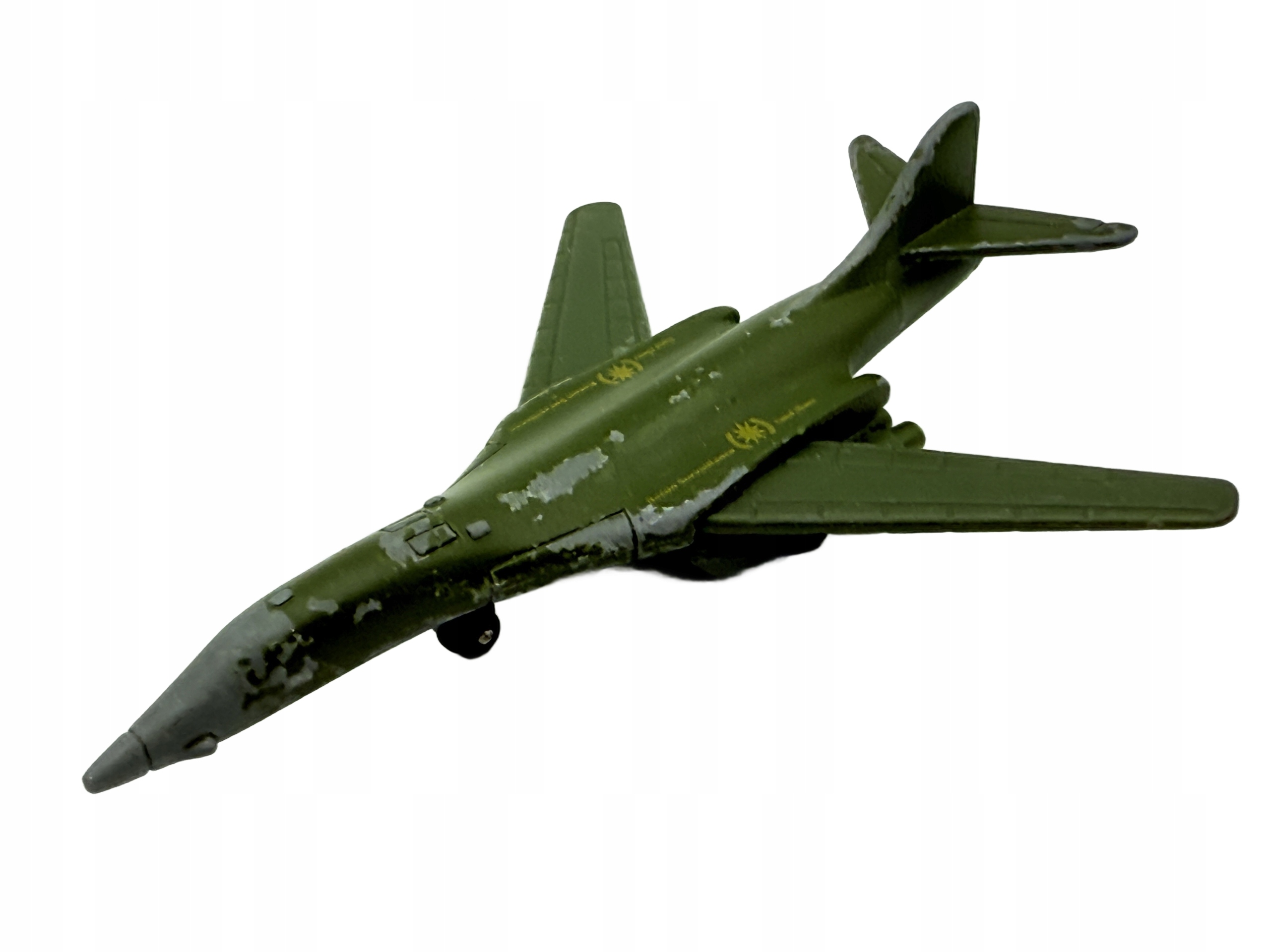 В пружине представлена модель самолета B-1B Lancer, известную своей впечатляющей производительности и характерным внешним видом. Изготовленный из металла, он имеет зеленые цвета с серыми акцентами, что дает ему подлинный военный характер. Модель особенно интересна для коллекционеров из -за их деталей и отпечатков с военным мотивом. Несмотря на видимые признаки использования, такие как расщепления краски, пружина сохраняет свое очарование и является интересным элементом каждой коллекции воздуха.