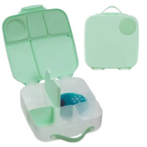 Большая коробка для завтрака с ручкой для переноски, имеет несколько отсеков разных размеров, которые могут быть адаптированы к упакованной пище. оснащено местом для охлаждающей вставки (включено) идеально подходит в качестве ланч -бокса для школы, детского сада или в поездке.