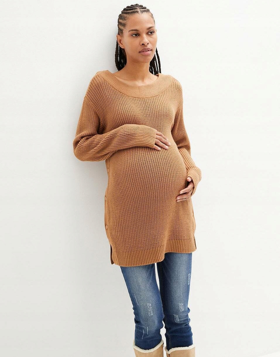 ДЛИННЫЙ КОРИЧНЕВЫЙ СВИТЕР ДЛЯ МАТЕРИАЛОВ, КЛАССИКА НА ОСЕНЬ-ЗИМУ – теплый, мягкий и стильный свитер для беременных классического коричневого цвета. Удлиненный крой идеально облегает фигуру, обеспечивая комфорт и свободу растущему животу. Идеально подходит для холодных осенних и зимних дней – с леггинсами, джинсами или колготками.