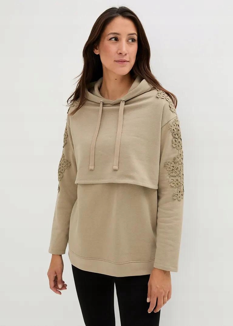 Практичный свитшот для беременных и кормящих зеленого цвета сочетает в себе удобство ношения с элегантной деталью в виде кружева. Изготовленный из мягкого, гибкого материала, он обеспечивает комфорт в течение всего дня как во время беременности, так и во время кормления грудью. Функциональный крой и сдержанные решения облегчают доступ к кормлению, а нежное кружево придает женственный шарм.