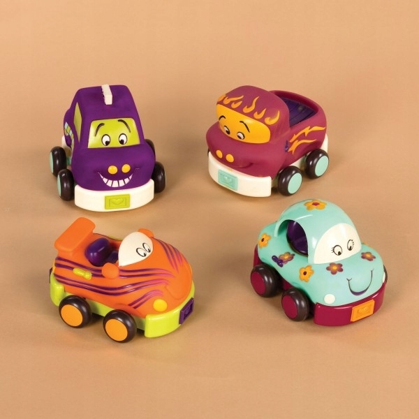 wheeee -iis -мягкие, резиновые, прохладные автомобили для Todddlers с приверткой. Перетащите машину на землю, затем отпустите вперед, и она создает несколько метров впереди! Игрушечные транспортные средства довольно велики, благодаря тому, каких детей могут играть с ними. Автомобили имеют разные цвета, улыбающиеся лица и декоративные узоры на масках (цветы, пламя, полосы и т. Д.). Все они движутся на пластиковых колесах. Некоторые модели оснащены гремучими, благодаря которой они издают звуки при движении.