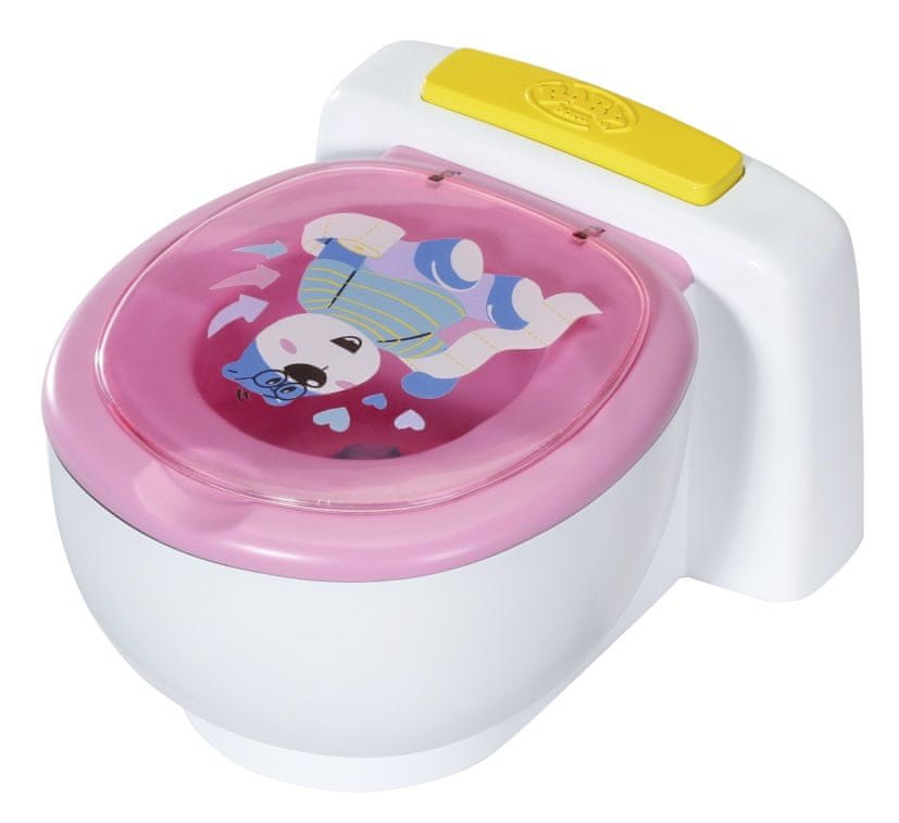 Baby Born уже большая девочка. Она ходит в туалет сама. Как только она садится на свой белый унитаз с розовым сиденьем, сразу слышно, что она уже писает. Пауза для аплодисментов... Теперь вы можете услышать ее полный счастья смех. Малыш может даже покакать самостоятельно. Разноцветные блестящие какашки попадают в унитаз. Быстро, надо промыть! После нажатия кнопки смыва какашки исчезают и слышен звук смываемой воды.