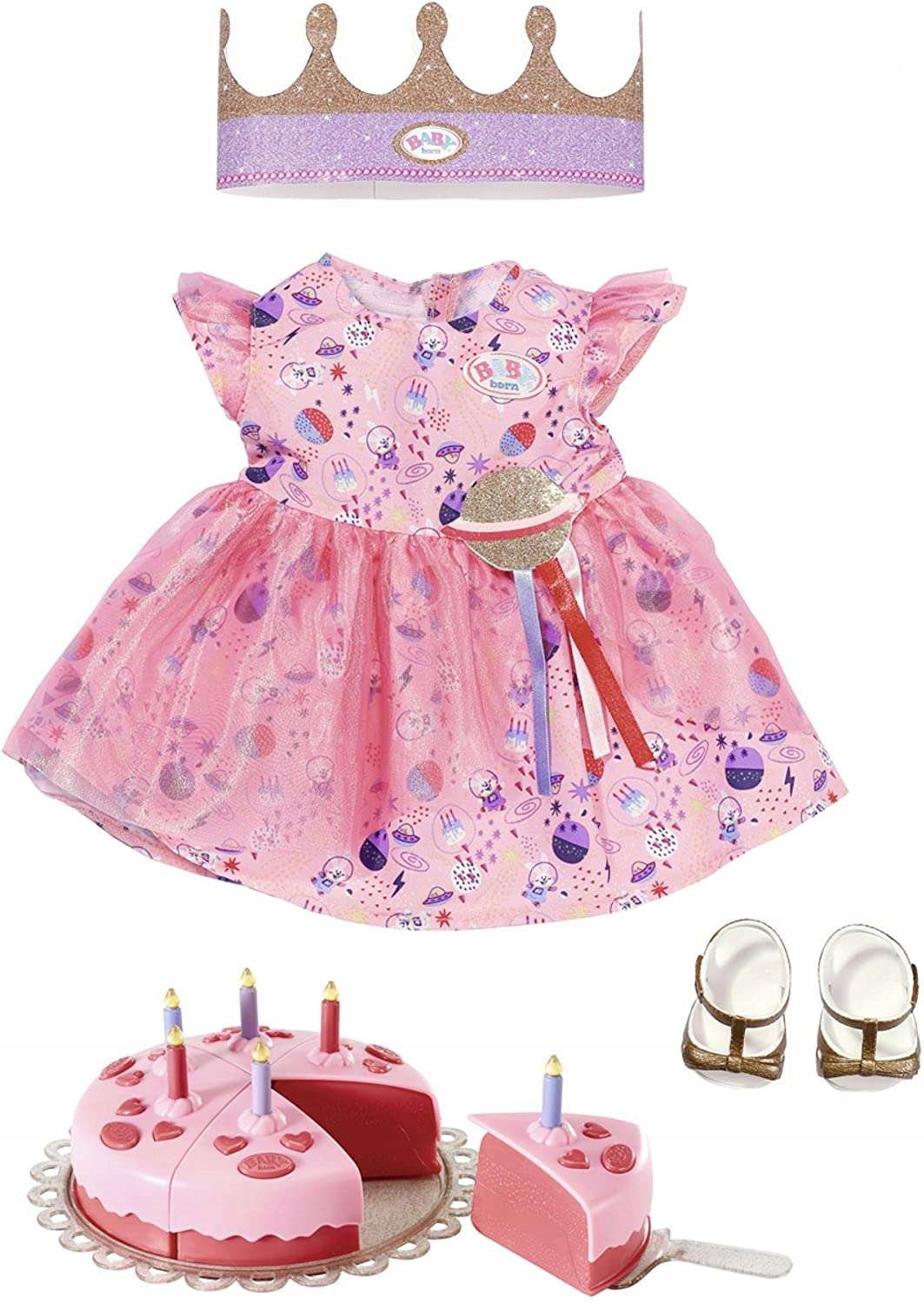 "Если задуешь все свечи сразу, то тебе повезёт!" Маленькая принцесса празднует свой день рождения. Он утверждает, что ему 30 лет! Конечно, у нас здесь есть праздничный торт со свечами. Его разрезают на шесть частей, каждая из которых покрыта розовой глазурью. В этот особенный день именинница одета в розовое платье с асимметричными рюшами из тюля. На платье есть принты с космическими мотивами. На брюхе имеется аппликация с эмблемой планеты. Золотые босоножки завершат образ. Именинная корона на голове Бэби Борна сверкает, как звездное небо. Прием был просто бесподобным!
