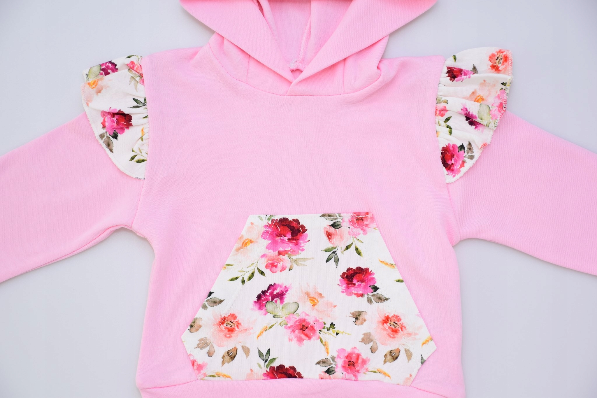 - ✅Розовое худи. Спереди карман (кенгуру) с яркими цветами. Цветочные рюши на плечах. На капюшон пришиты цветочные ушки.