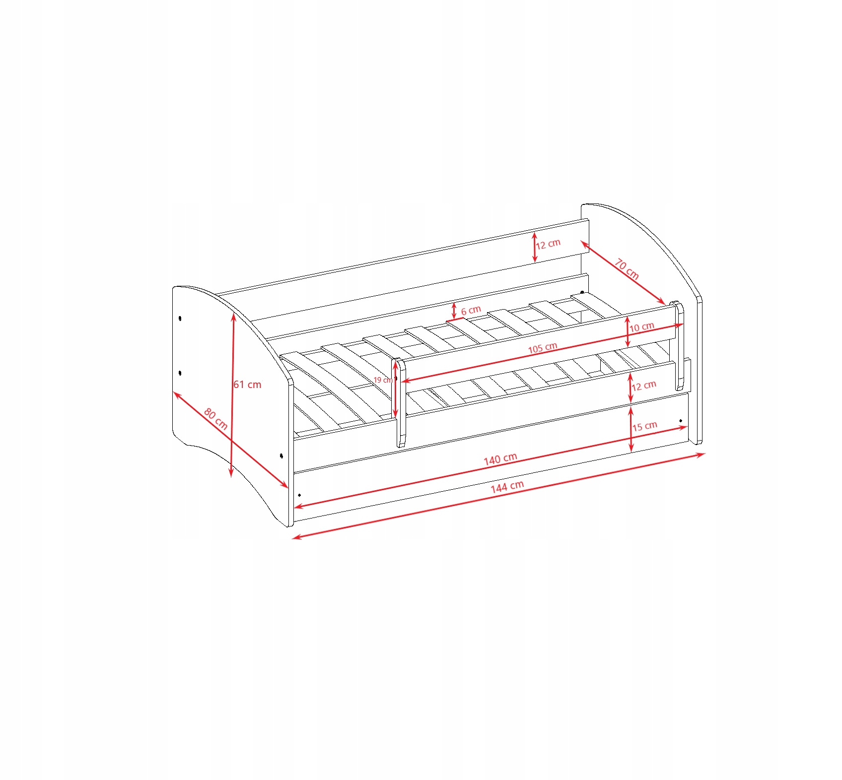 для безопасности все края округлены, а фронты дополнительно закреплены с резиновым профилем. Используя болты, тянущая максимальная нагрузка на кровать составляет 100 кг.