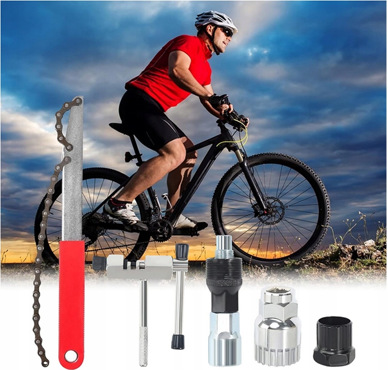 - В комплект входят прерыватель цепи и гаечный ключ. обгонная муфта, съемник кривошипа, ключ каретки и ключ для откручивания кассет.