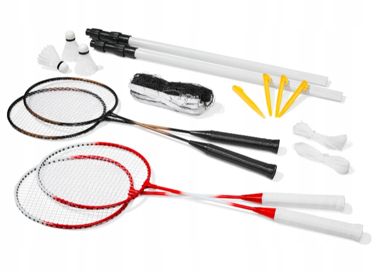- Полный комплект для бадминтона с сеткой для 4 игроков: 4 ракетки, 3 волана, 1 сетка, 4 натяжных шнура, 4 колышка и 2 телескопических шеста для сетки; li>