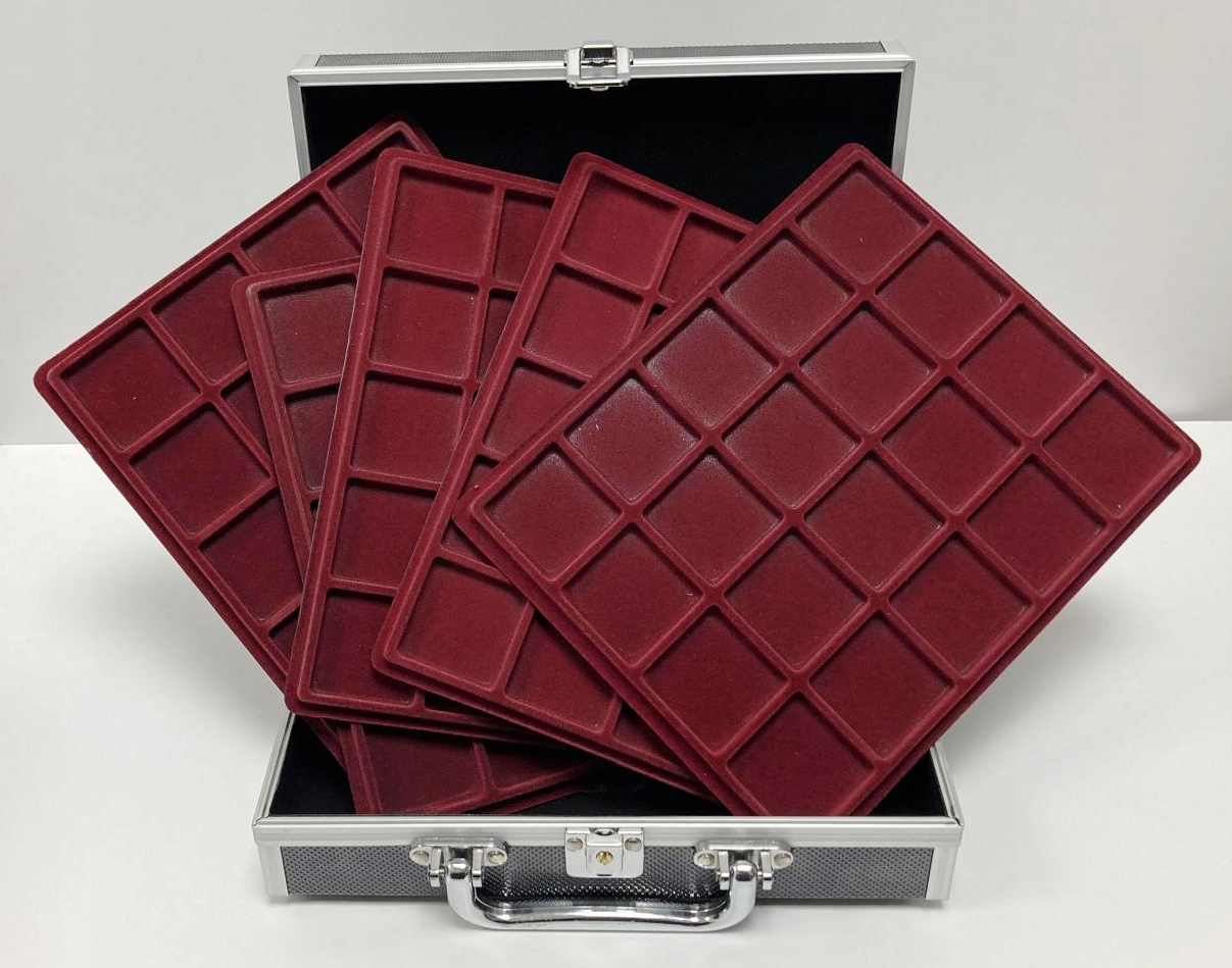 коробка содержит по 5 лоткам, каждый с местом для 20 монет. Размеры отверстия: 40 х 40 мм.