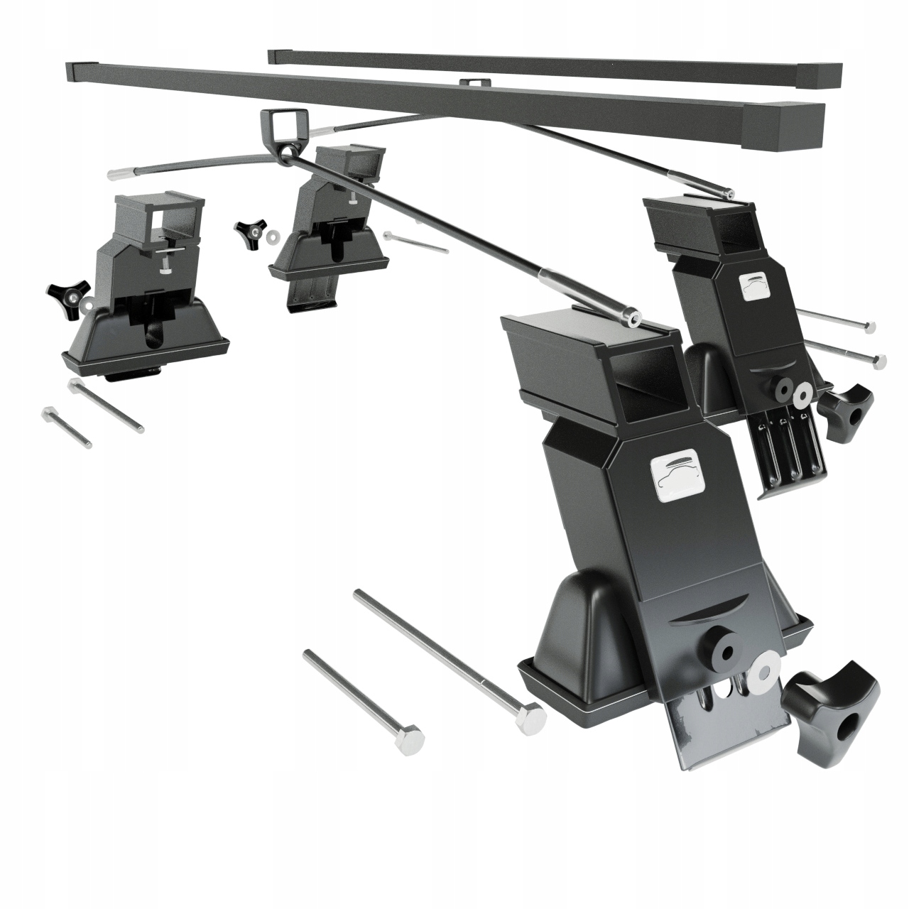 Базовый багажник на крыше состоит из 2-х цельных стальных балок и 4-х ручек Tramp AM-6 (так называемых лап), адаптированных к типу крыши автомобиля, его модели и поколению.