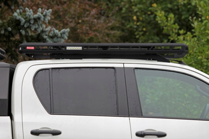 - В передней части багажника на крыше предусмотрено место для установки переднего освещения автомобиля в виде галогенных ламп дальнего света, которые можно установить под багажник, или светодиодных панелей адаптированного размера к проему в салоне. стеллаж, размеры которого 540х50мм(отдельные панели: Wesem-link, 4wd-link). Входящая в комплект крышка для открывания панели позволяет использовать стойку без переднего освещения. Также имеются места для крепления четырех специальных рабочих фонарей (BA006), установленных внутри задней и боковой частей багажника. Такое решение защищает светильники и их установку от механических повреждений.