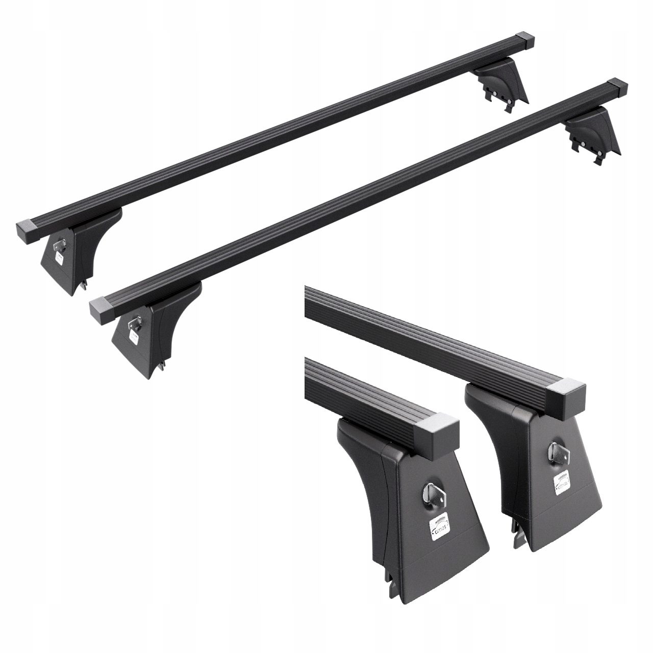 Представленная стойка состоит из прочных монтажных захватов (головка + крышка с замком + сменный КОМПЛЕКТ), изготовленных из металла и пластика, и двух стальных балок. с черным ПВХ покрытием.>прямоугольного сечения (30х20мм). Стойка обеспечивает надежность крепления к точкам крепления на крыше (под пластиковой планкой) автомобиля. Весь комплект выполнен в универсальном черном цвете. КОМПЛЕКТЫ, то есть монтажные ножки, можно заменить, чтобы адаптировать стойку к другому автомобилю.