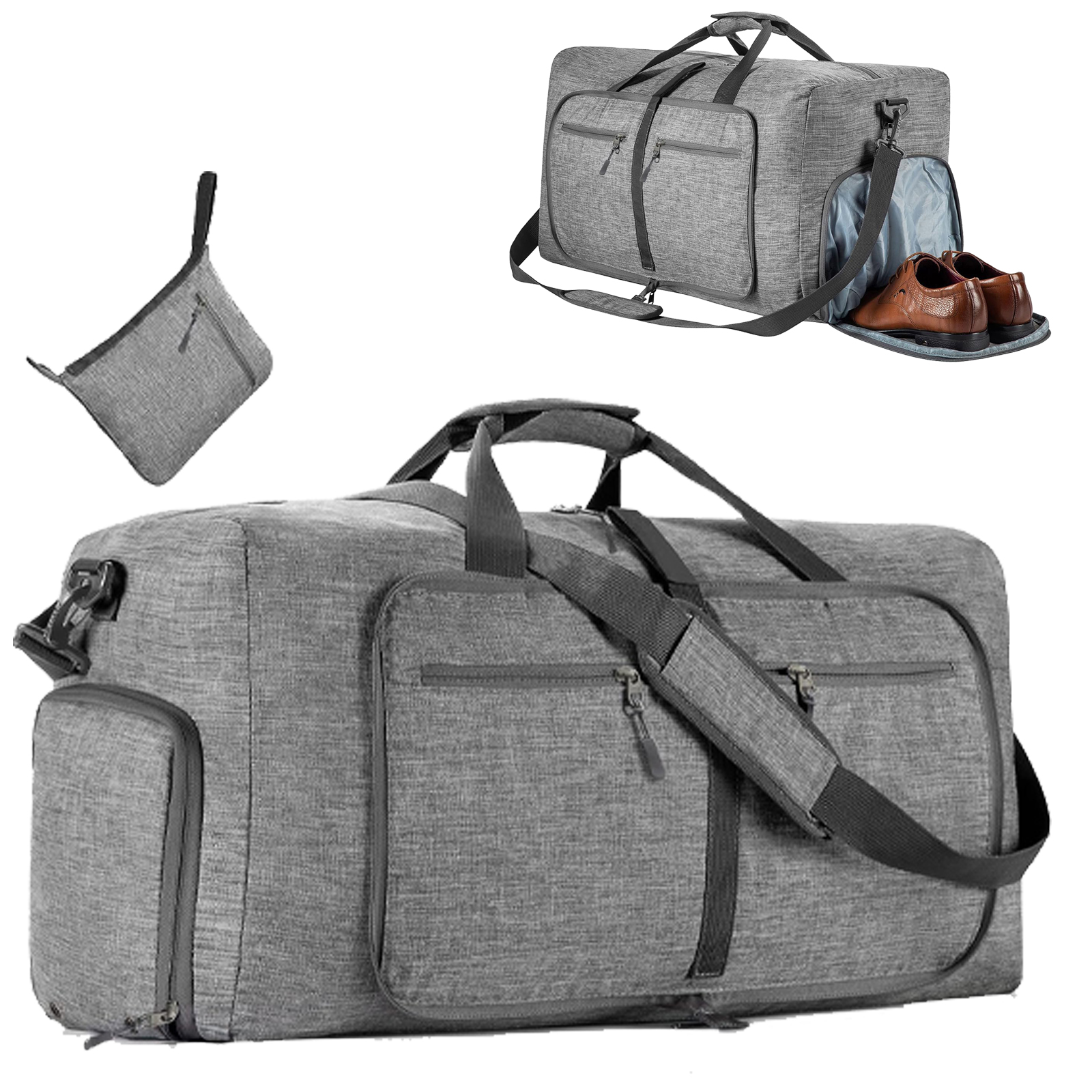 - женская, мужская дорожная сумка, большой размер: 61 x 27 x 34 см, объем 65 л. Эта большая дорожная сумка весит всего 400 г. Ее можно быстро сложить до компактных размеров 24 х 21 см. Она занимает очень мало места, а в раскрытом состоянии имеет объем более 65 литров, поэтому ее можно использовать в качестве сумки для багажа в случае, если ваш чемодан. набухает.