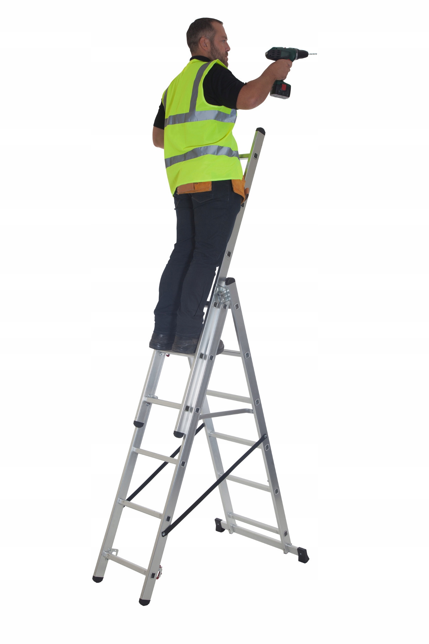 Лестницу можно использовать как стандартную стремянку (автономно стоящую). В таком положении лестница идеально подходит для работы по дому, стройки и т.п.