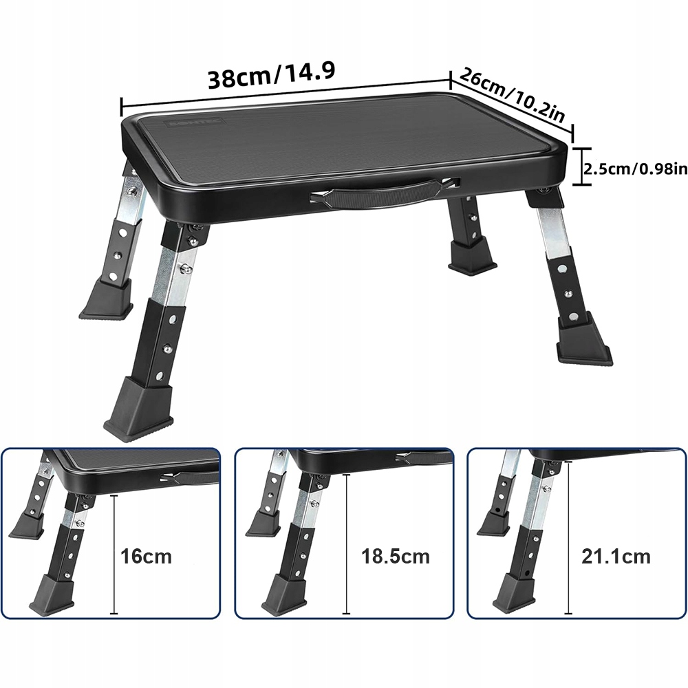 Ступенька имеет три высоты: 16 см, 18,5 см и 21,1 см. Идеально подходит для взрослых, пожилых людей и детей, позволяя им безопасно и комфортно добираться до высоких полок, раковин и других труднодоступных мест. Идеально подходит для использования дома, в офисе или на кухне.