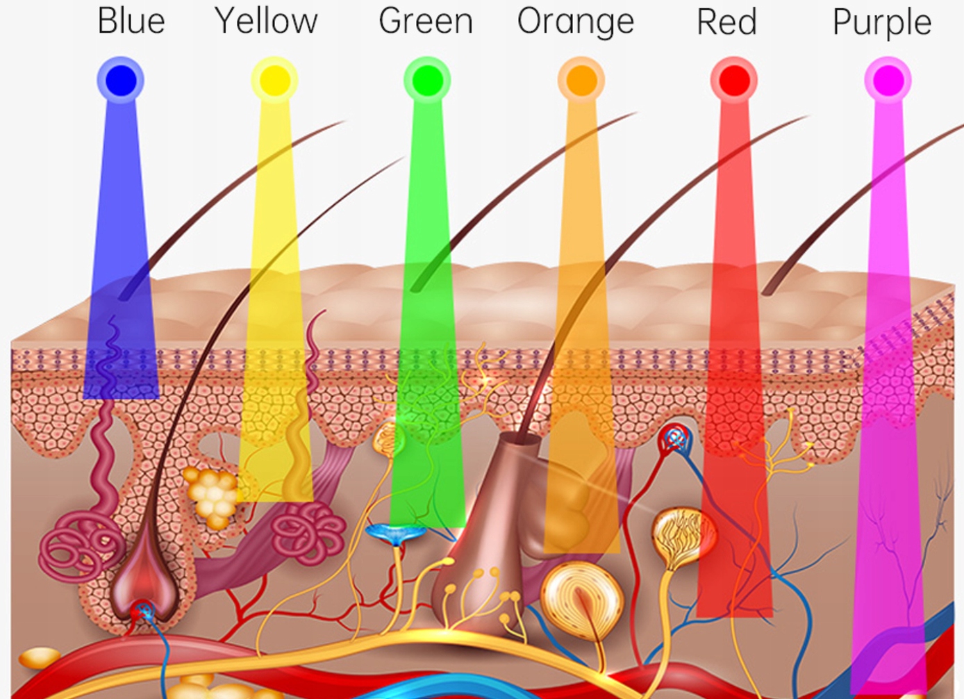 Циркулирующий свет, изготовленный из красного, синего, зеленого, оранжевого, желтого и фиолетового, непосредственно обнажает поверхность кожи, проникая в кожу, уменьшая морщины и восстанавливая эластичность кожи