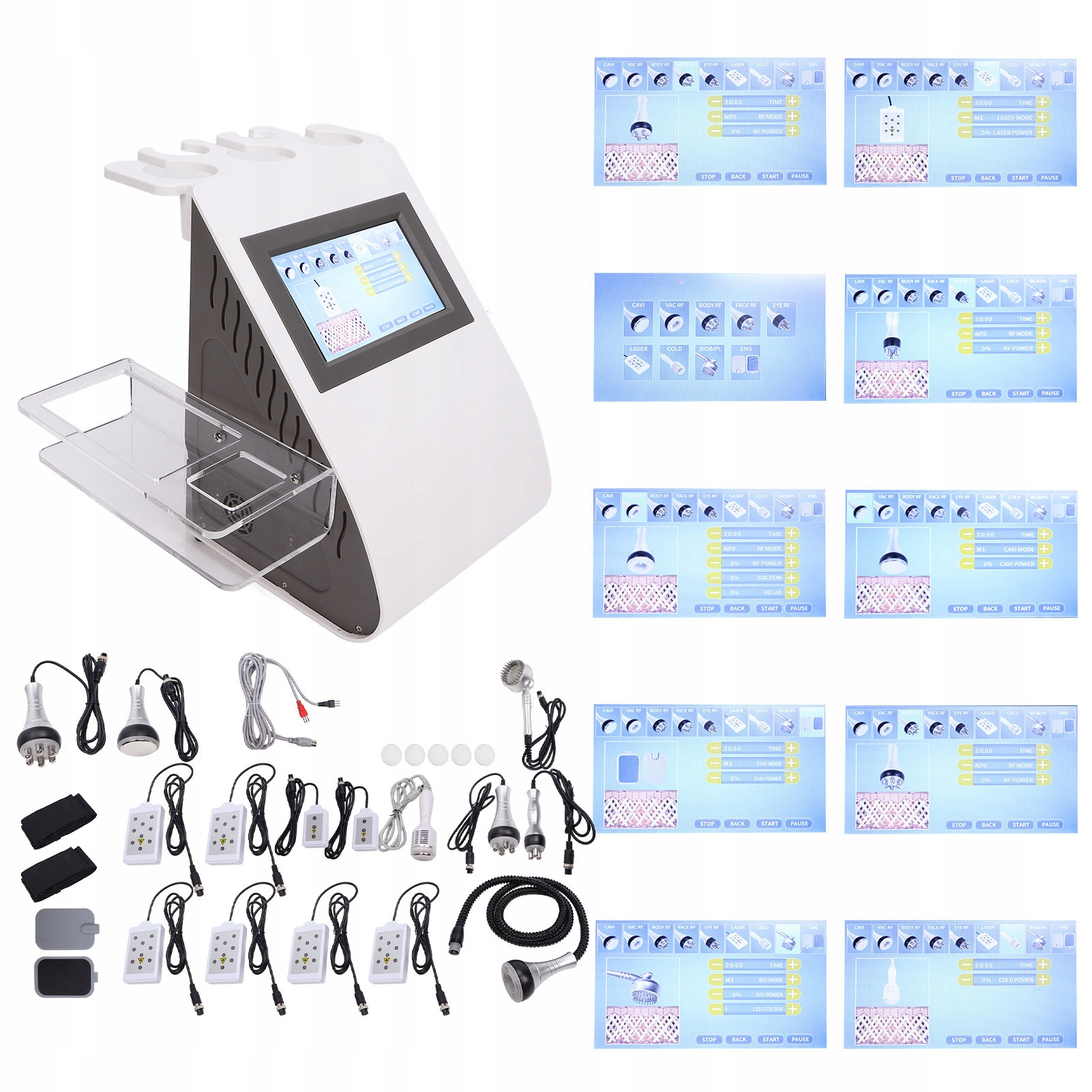 - Эффективность: одно устройство с множеством функций, уход за телом, уменьшение жира, удаление кислоты, омоложение кожи. , укрепление лица, уменьшение темных кругов под глазами, отказ от расслабления тела, восстановление пор и тренировка мышц.