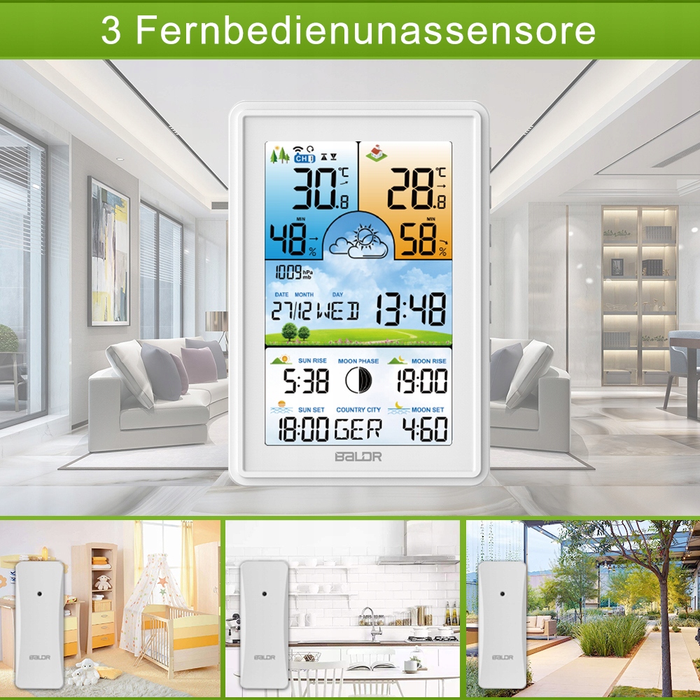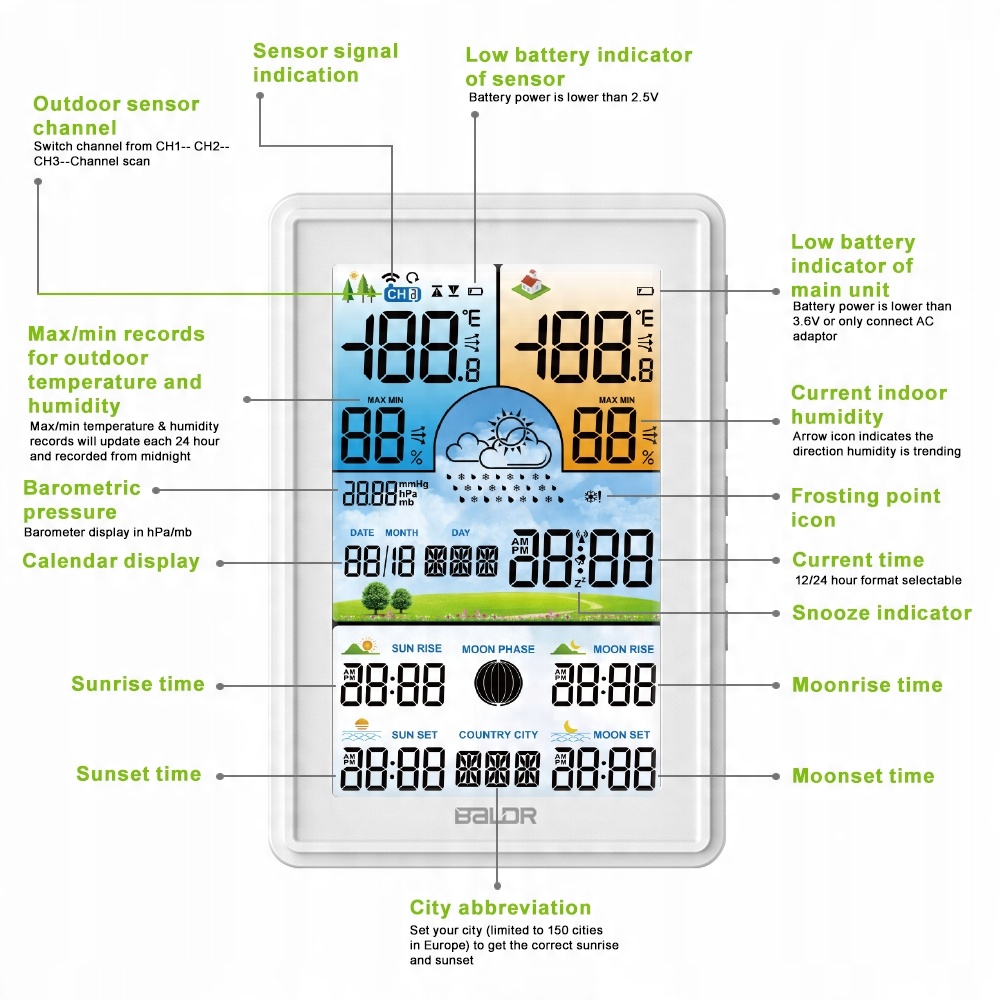 Многофункциональная беспроводная метеостанция Baldr B360-V2 с функцией оповещения о погоде: измеряет температуру в помещении и на улице, а также предсказывает местный прогноз погоды, что делает его идеальным выбором для получения точных измерений, доступных с одного взгляда на большой, легко читаемый дисплей.
