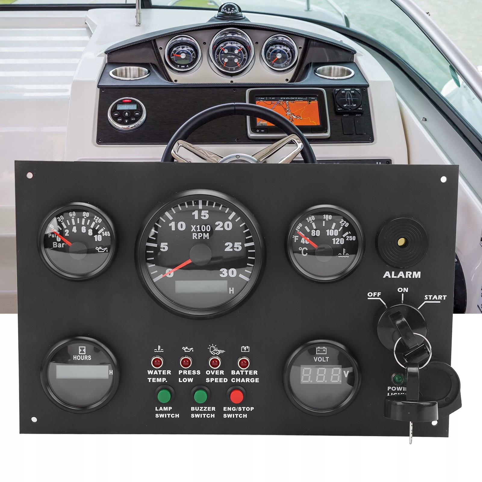 Две клавиши зажигания доставляются, которые можно использовать напрямую. Панель оснащена такими функциями, как тревога температуры воды, тревога по ипотеке, сигнализация с чрезмерной скоростью, сигнализация зарядки аккумулятора, выключатель света, переключатель зуммера и сигнализация двигателя. 9-32VDC